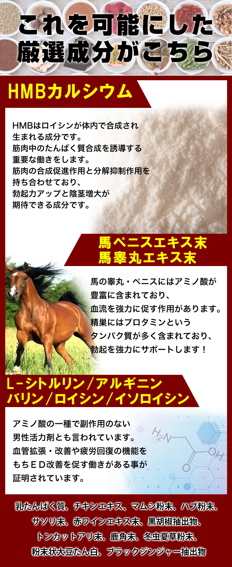 原材料名 L-シトルリン(国内製造)、乳たんぱく質(乳成分を含む)、HMBカルシウム、チキンエキス(チキンエキス、デキストリン)(鶏肉を含む)、マムシ粉末、ハブ粉末、サソリ末、赤ワインエキス末、黒胡椒抽出物、トンカットアリ末、鹿角末、冬虫夏草粉末、粉末状大豆たん白(大豆を含む)、ブラックジンジャー抽出物(ブラックジンジャー抽出物、デキストリン)、馬ペニスエキス末、馬睾丸エキス末 / セルロース、トレハロース、ゼラチン、ステアリン酸カルシウム、着色料(二酸化チタン)、微粒酸化ケイ素、