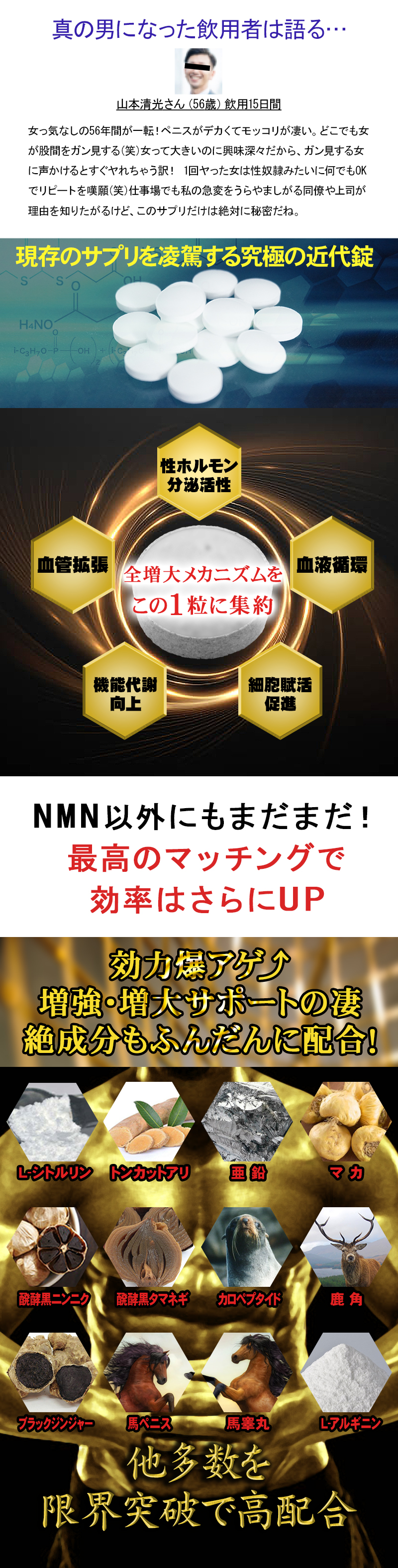 原材料名ニコチンアミド・モノヌクレオチド(国内製造)、チキンエキス(チキンエキス、デキストリン)(鶏肉を含む)、L-シトルリン、トンカットアリ末、亜鉛含有酵母、マカパウダー、醗酵黒ニンニクパウダー、醗酵黒タマネギ、カロペプタイド(乳糖、オットセイ骨格筋抽出物)(乳成分を含む)、鹿角末、ブラックジンジャー抽出物(ブラックジンジャー抽出物、デキストリン)、馬ペニスエキス末、馬睾丸エキス末 / セルロース、ステアリン酸カルシウム、微粒酸化ケイ素、L-アルギニン、L-バリン、L-ロイシン、L-イソロイシン、L-トリプトファン、シクロデキストリン