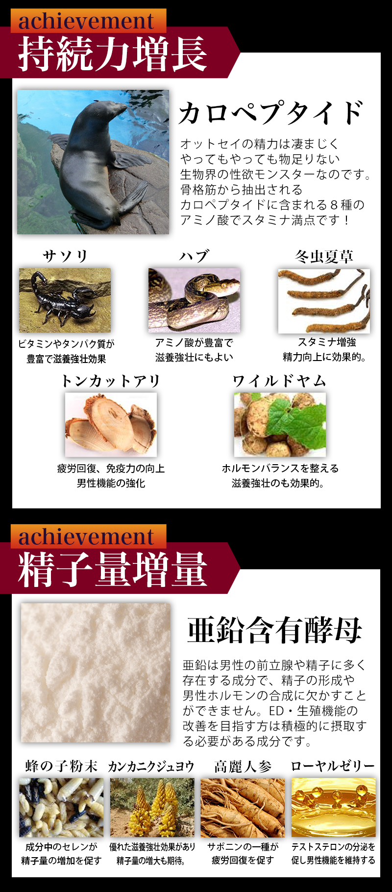 亜鉛含有酵母、カロペプタイド(乳糖、オットセイ骨格筋抽出物)(乳成分を含む)、サソリ末、ハブ粉末、ブラックジンジャー抽出物(ブラックジンジャー抽出物、デキストリン)、馬睾丸エキス末 / セルロース、ステアリン酸カルシウム、微粒酸化ケイ素、L-アルギニン、シクロデキストリン